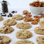 - Cream the butter and sugars until smooth. Add the vanilla extract, and eggs, one at a time. Mix to fully incorporate. Gently stir in flour mixture, chocolate chips, and pretzel bits. Form into small balls using a ⅛ cup measure, and place 1-inch apart on a parchment-lined baking sheet.