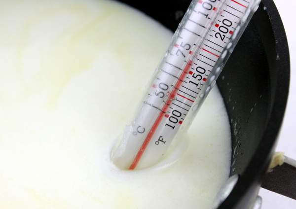 - Heat the milk to 180 F, stirring with a spatula so as not to burn it.