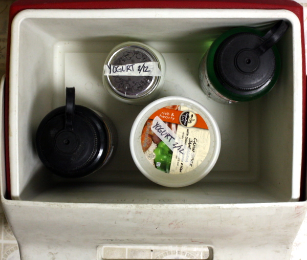 Pour the mixture into whatever sterilized containers you've chosen, seal them, and place them in incubation for 12-24 hours. I like to incubate at right around 105 degrees, so I usually fill water bottles with water slightly hotter than that and place them in a cooler. I incubate for 24 hours to maximize the probiotic growth and ensure the thickest, creamiest result possible.