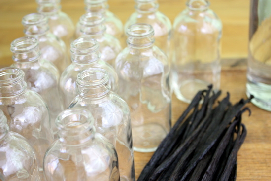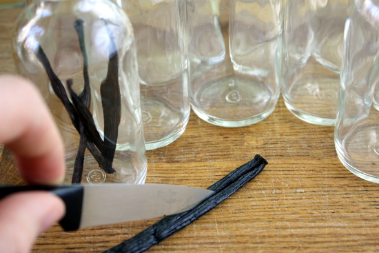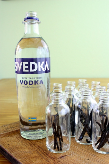 - With a knife or scissors, split vanilla beans lengthwise, then across - you should end up with four pieces per bean. Put six pieces in each bottle, add 4 oz of vodka, tighten lid, and shake. Let the bottles sit, away from sunlight, for a month - shaking every week for better flavor. Dress the bottles up with cute labels and give away!