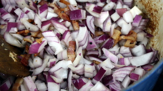 When all of the chicken is done, remove and set aside on a plate. Add the sausage (or bacon), and cook until some fat is rendered. You'll see it! Add the onions, and extra garlic (optional) at this point.