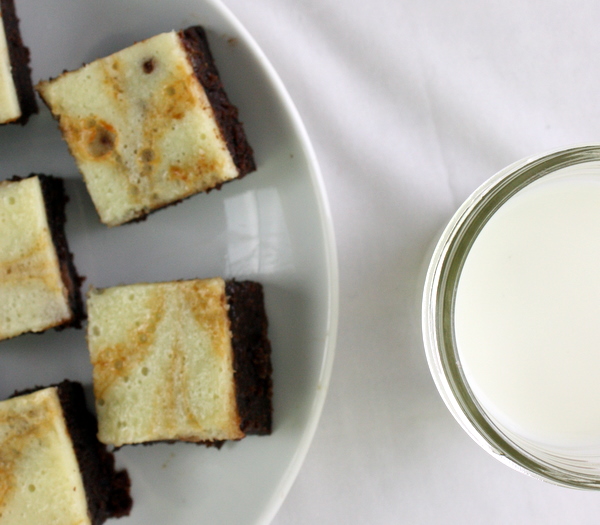 These brownies are a mix of a few things: my favorite brownie recipe (I made these ALL the time in high school!), cream cheese and sugar (you cannot go wrong here), and goat's milk caramel. Goat's milk caramel!? Yeah, it's awesome. I'd never had it until I received a jar for Christmas - which is awesome because I LOVE goat cheese, so why wouldn't I like goat's milk caramel? Even Derek, who claims to hate goat cheese, gobbled these suckers down in record time. That may have had something to do with me not mentioning the origin of the caramel. I guess the secret is out now!