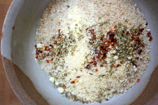 Then you dip it in your batter. Let the excess batter drip off (give it a little shake), then coat it in panko-herb goodness. Don't go light!