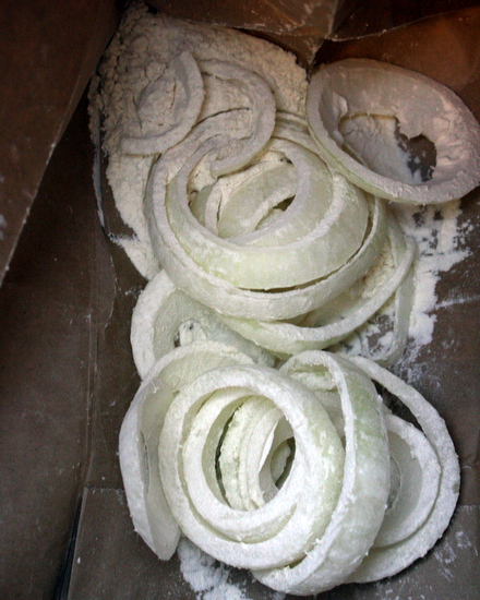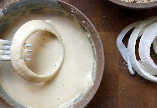 Slice your onions in to rings about ½" thick. Prepare the batter by mixing the ½ cup flour with enough liquid (beer or milk) to make it runny enough to stick to the back of a spoon, but not more than a thin coating. In a separate bowl, mix the bread crumbs, grated parmesan, red pepper flakes, oregano, and pepper.