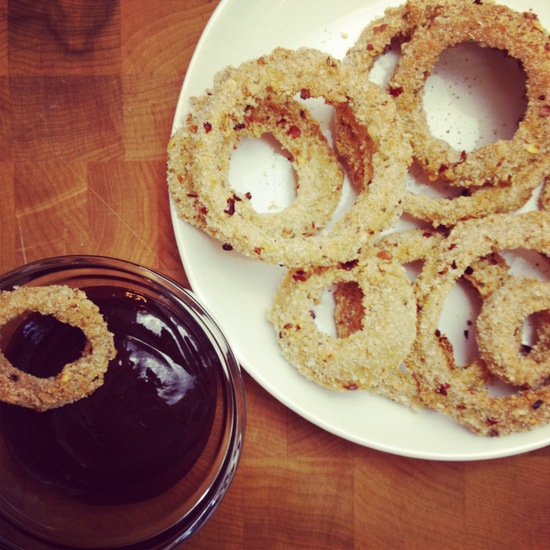 There you go! Bake them up, flipping halfway though, then enjoy with the topping of your choice. While I'm not a barbecue-loving girl in general, I think onion rings are MADE to be eaten with a sweet barbecue sauce!