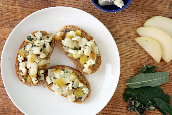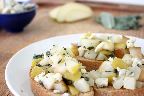 - Top toasted bread with pear mixture and crumbled blue cheese. Finish with fresh ground black pepper, and olive oil if desired.