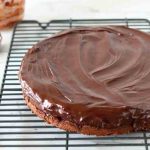 - When the cake is cool, make the ganache. Heat the butter and chocolate chips together until melted, pour over the cake and smooth to cover.