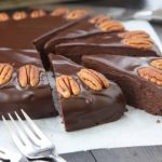 - When the cake is cool, remove it from the pan. Heat the heavy cream until almost boiling, then remove from heat and add chocolate chips. Let the mixture sit for one minute before stirring until completely smooth. Pour over the top of the cake, smooth the top, and decorate with the toasted pecan halves.
