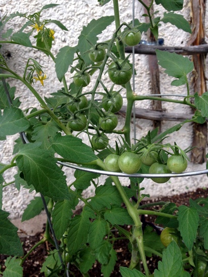 - Tomatoes: SO EXCITING! One of the plants is HEAVY with green tomatoes (like... 30?), and they're getting bigger by the day! I think I even spotted one starting to turn red today! One other has a few small ones, and the other two have a lot of flowers: we're hoping they'll all be successful! One of the plants is significantly yellow, which we are hoping we can remedy with a bit more TLC. We also did a little bit of pruning to encourage more fruit production - something we're not entirely sure about, but thought we'd give it a go!