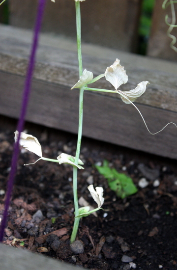 - Peas: Peas, peas, peas. I planted two varieties of peas in the greenhouse, both of which grew at astronomical rates. One kind promptly started shriveling up at the bottom (the leaves dried and turned a creamy color), and I have no pronounced them dead. I transplanted the others outside a few weeks ago, and have since felt like I botched a lobotomy.