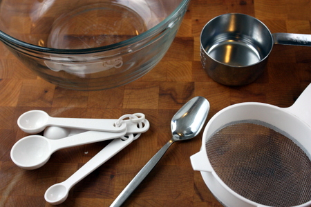 All you need is normal flour and cornstarch. For tools, have a tablespoon, a bowl, a sieve, and a 1 cup measure.