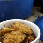 - Add the tomatoes, and all spices (including bay leaf). Mix thoroughly and cook for a minute before adding the rice. Mix the rice into the vegetable mixture, then smooth the top and carefully layer the browned chicken on top. Pour in enough chicken stock to cover the chicken. Lower the heat to LOW and cover the pot. Let simmer for 45 minutes to an hour, adding more stock as needed, until rice is done. Salt as needed, and serve!