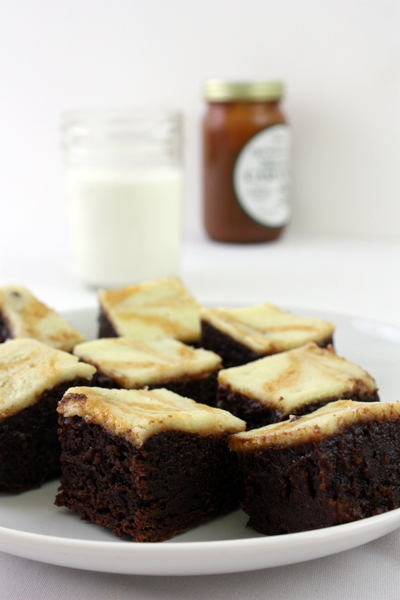These brownies are a mix of a few things: my favorite brownie recipe (I made these ALL the time in high school!), cream cheese and sugar (you cannot go wrong here), and goat's milk caramel. Goat's milk caramel!? Yeah, it's awesome. I'd never had it until I received a jar for Christmas - which is awesome because I LOVE goat cheese, so why wouldn't I like goat's milk caramel? Even Derek, who claims to hate goat cheese, gobbled these suckers down in record time. That may have had something to do with me not mentioning the origin of the caramel. I guess the secret is out now!