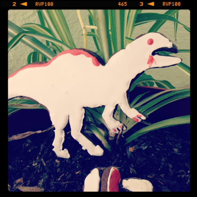 I'll admit: I could get much better at this. For a first time, though, I'm pretty proud of myself! Having the appropriate kitchen accoutrements would make it a bit easier, but I got by with plastic bags and kebob skewers. I didn't branch out too much with the designs this time, but next time I'm hauling out the big guns. The next cookies won't know what hit 'em! I did get a little bit bold here, per Derek's request, and free-styled a velociraptor, which we later posed in our jungle protecting it's eggs.