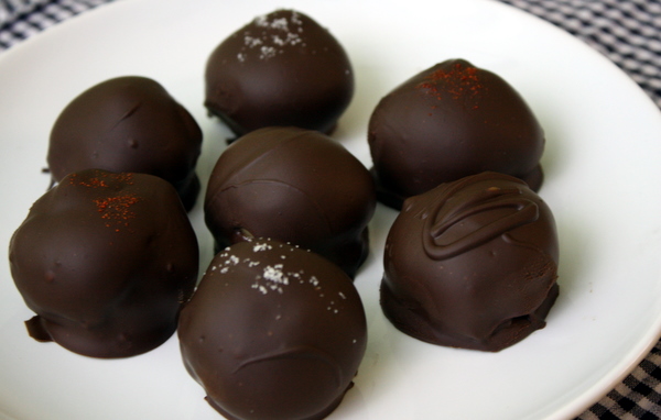 **Use ¾ cup smooth peanut butter in place of the butter, and increase the flour by ¼ cup. - Chill dough until you can handle it easily. Roll into small balls (I recommend ¾" in diameter) and set aside on a cookie sheet lined with parchment or wax paper. Melt your chosen chocolate in a heatproof bowl, then use two forks to dip each ball of dough into the chocolate. Shake/tap off excess chocolate, set the truffle back onto the cookie sheet, and top with sea salt, paprika, or leave plain.