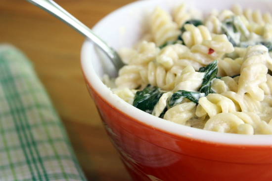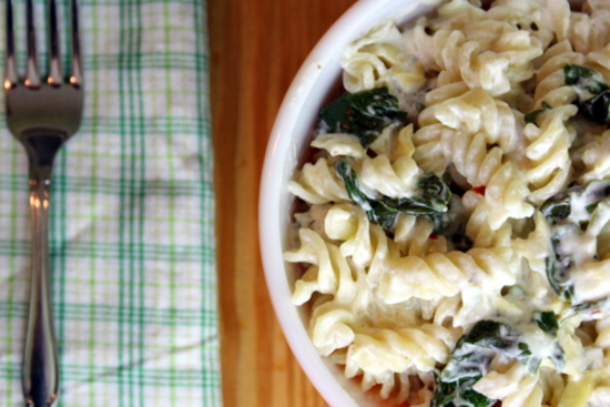 Before the lazy weekend completely commenced, we had a fantastic party on Friday night (is that bragging? I had fun, so I count it as a success!). I made some spinach-artichoke dip which I could NOT separate myself from. I'm an addict. Have you ever met anyone who DIDN'T like spinach artichoke dip? I haven't, and I think anyone who claims they don't like it probably just needs to try again. It's just SO good! Tangy, salty, zesty, sometimes spicy - I'm not sure a dip could get any better. But this post isn't about the dip (which will come soon!): it's about making pasta TASTE like the dip without having to put in nearly as much time.