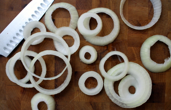 I had one of those "I can make that!" moments a few weeks ago in regards to onion rings: one of those things (like yogurt, or salsa, or pretzels!) I never really considered making at home, until I actually thought about it and realized it would be easy as pie! That and my blinding craving for onion rings (ALL WEEK), which was a driving force in the creation of these babies.