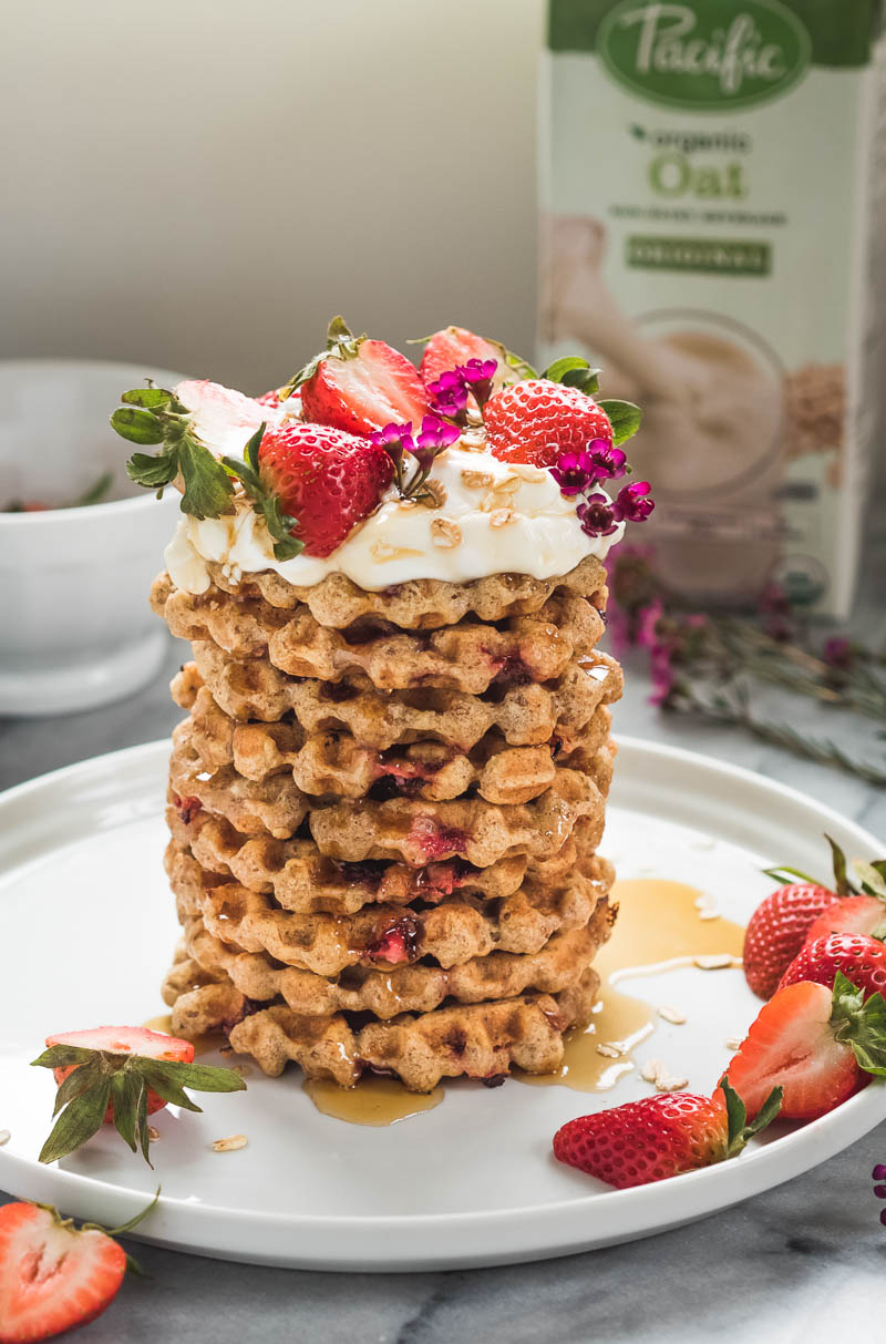 But let's talk about these vegan strawberry oat waffles, shall we? I made these just a few days before we left for Japan, and was clearly inspired by cherry blossom season and had to put some pretty flowers on my waffles. Practical, right? Whatever - they're pretty and I am all about the flowers these days! But more about the waffles: these are using Pacific Food's Organic Oat Non-Dairy Beverage, which is really freaking tasty. I'm a huge fan of it for a creamy non-dairy option. You guys know that I'm not vegan, but for some reason I got it in my head that I really wanted to make vegan waffles (how hard can it be?!) - and I failed HARD the first time. I made floppy gross oat patties (which I served to guests, because OF COURSE I TRIED A NEW RECIPE WHEN GUESTS WERE COMING OVER. #FACEPALM). LUCKILY round 2 went way way way better, and resulted in these babies. They're crisp! They're flavorful! They're gorgeous and EASY and, yes, still vegan!
